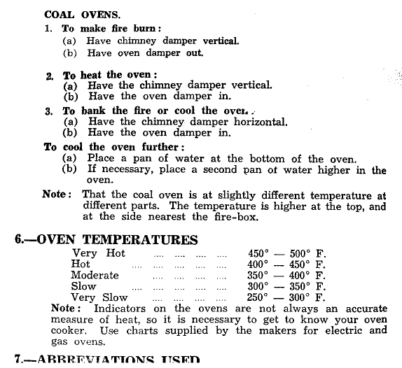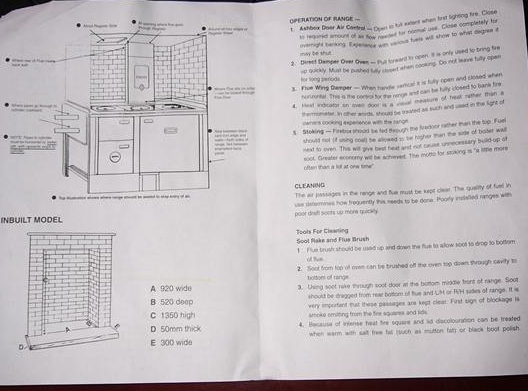 OPERATION OF RANGE -- 1. Ashbox Door Air Control - Open to full extent first lighting fire. Close required amount of air flow needed for normal use. Close completely for overnight banking. Experience with various fuels will show to what degree it may be shut. 2. Direct Damper Over Oven - Pull forward to open. It is only used to bring fire up quickly. Must be pushed fully closed when cooking. Do not leave fully open for long periods. 3. Flue Wing Damper - When handle vertical it is fully open and closed when horizontal. This is the control for the range and can be fully closed to bank fire. 4. Heat indicator on oven door is a visual measure of heat rather than a thermometer. In other words, should be treated as such and used in the light of owners cooking experience with the range. 5. Stoking - Firebox should be fed through the firedoor rather than the top. Fuel should not (if using coal) be allowed to be higher than the side of basket wall next to oven. The will give best heat and not cause unnecessary build-up of soot. Greater economy will be achieved. The motto is "a little more often than a lot at one time" CLEANING The air passages in the range and flue must be kept clear. The quality of fuel in use determines how frequently this needs to be done. Poorly installed ranges with poor drafts soot up more quickly. Tools For Cleaning Soot Rake and Flue Brush 1. Flue brush should be used up and down the flue to allow soot to drop to bottom of flue. 2. Soot from top of oven can be brushed off to oven top down through cavity to bottom of range. 3. Using soot rake through soot door at the bottom middle front of range. Soot should be dragged from rear bottom of flue and LH or RH sides of range. It is very important that these passages are kept clear. First sign of blockage is smoke emitting from the fire squares and lids. 4. Because of intense heat fire square and lid discolouration can be treated when warm with salt free fat (such as mutton fat) or black boot polish.