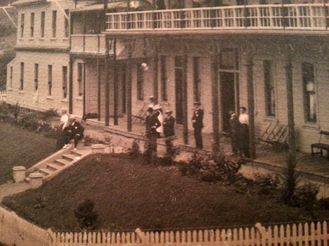The newer build included vertical pseudo-Tudor decoration of gables, conservatory enclosing far-bottom verandah and encased near gable end top & bottom. The chimneys have pots and balcony fences are different as well. Most other photos available today are of the newer building, I guess because cameras became more prevalant and this building wasn't around for long.