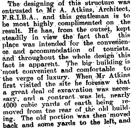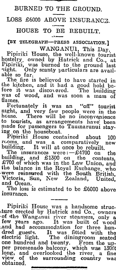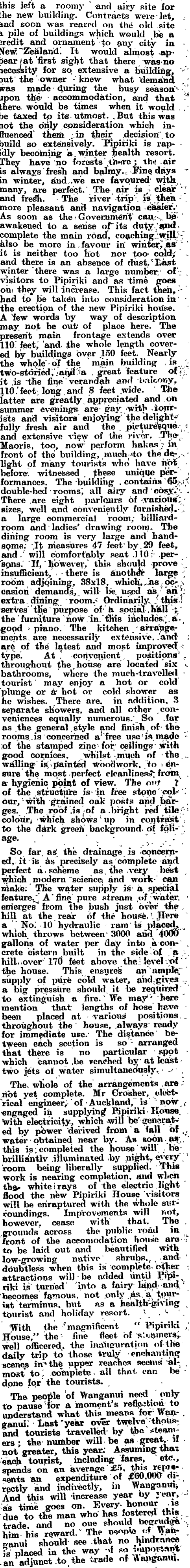 In July 1901 Hatrick purchased Pipiriki House, the only accommodation house in the settlement, and in 1902 replaced part of the original building with a new tourist hotel. At the end of 1903 he extended the river service a further 89 miles to Taumarunui, which was then the terminus for the railway line from Auckland. The following year he had a large houseboat constructed in Taumarunui and floated down to the mouth of the Ohura River. It had accommodation for 36 guests and was fully equipped with modern conveniences including electric light. Hatrick was then able to provide a three-day service from Wanganui or Taumarunui, with overnight stops at Pipiriki House and the houseboat. In 1905 12,000 tourists stayed at Pipiriki House.